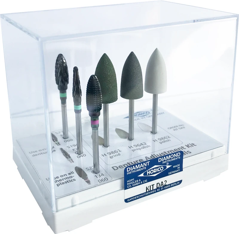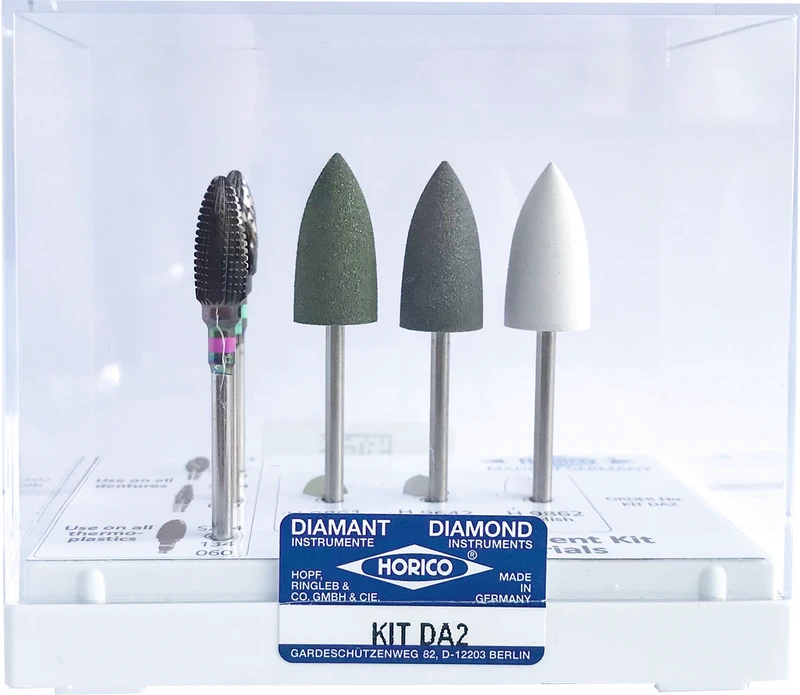 Prothesenkunststoffe einfach und effizient bearbeiten (Kit DA2). Wir haben das beliebte Kit DA weiterentwickelt mit noch besseren Fräsern für schnelleres Arbeiten. Vorteile: