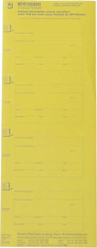 Unsere Adressfeldstreifen 730 sind die ideale Lösung für Ihre Patientenkartei. Diese praktischen Streifen bieten Ihnen die Möglichkeit, Adressen einfach und effizient zu überkleben, besonders geeignet für den Chipkartenausdruck.