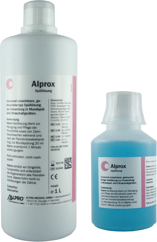 Gebrauchsfertige Spüllösung zur Anwendung in Mund- und Ultraschallgeräten. Alprox dienst zur Reinigung und Pflege der Mundhöhle sowie der Zahnfleischtaschen. Es reduziert die Vitalität von Paradontosebakterien, beseitigt Plaque und schützt vor Zahnstein.
