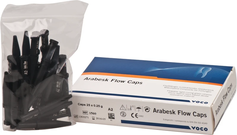 Besonders fließfähige Compositvariante auf der Basis von Arabesk Top. Für Füllungen bei Mikropräparationen und Approximalkavitäten, erweiterte Fissurenversiegelungen u. v. m. Arabesk Flow vereint die Materialvorzüge von Arabesk Top mit einer hohen Fließfähigkeit, die die Applikation in enge und kleine Kavitäten vereinfacht. Arabesk Flow in Caps ermöglicht die Direkt-Applikation.