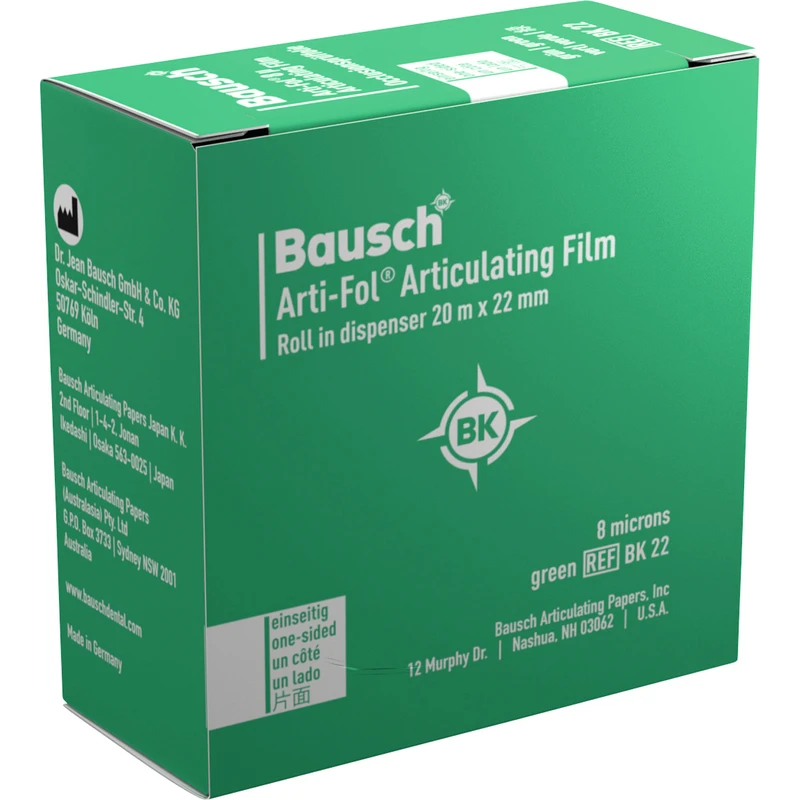 Artikulationsfolie 8 µ besonders gut zur Darstellung der statischen und der dynamischen Occlusion in mehreren Farben geeignet. Arti-Fol® metallic 8 µ markiert präzise auch feuchte Occlusalflächen. Ermöglicht ein effizientes Einschleifen, auch bei Relaxierungs- und Occlusionsschienen (Bruxismus).