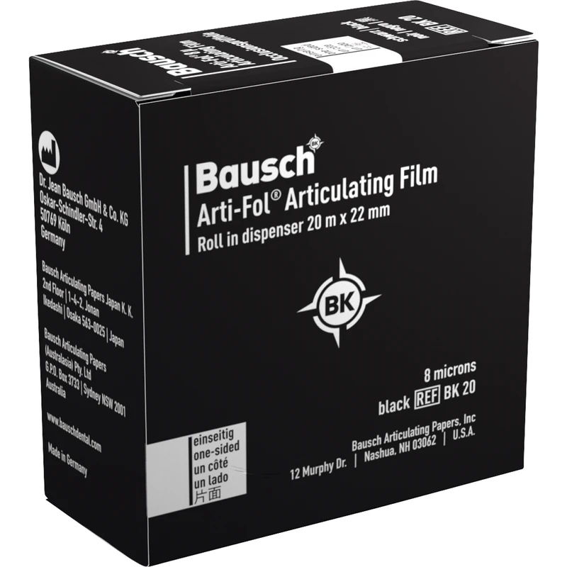 Artikulationsfolie 8 µ besonders gut zur Darstellung der statischen und der dynamischen Occlusion in mehreren Farben geeignet. Arti-Fol® metallic 8 µ markiert präzise auch feuchte Occlusalflächen. Ermöglicht ein effizientes Einschleifen, auch bei Relaxierungs- und Occlusionsschienen (Bruxismus).