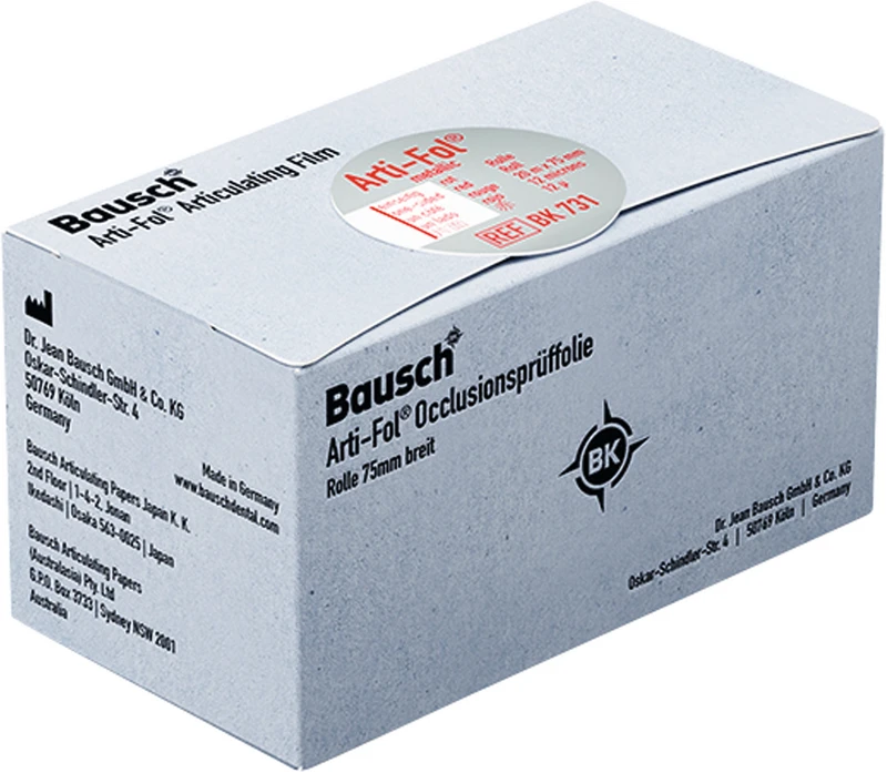 Arti-Fol® metallic 12 µ ist eine High Tech Prüffolie mit deutlich verbesserten Eigenschaften. Diese Prüffolie besteht aus einer metallisierten Polyesterfolie (Shimstock Folie) von nur 12 µ Stärke. Die Kombination aus einer zusammengesetzten Farbbeschichtung und einer metallisierten Folie bringt entscheidende Vorteile bei einigen Anwendungen. Durch die metallisierte Rückseite der Folie kann auch keine Verwechslung zwischen unbeschichteter und beschichteter Farbseite entstehen. Hohe Reißfestigkeit und geringe Materialstärke hervorragend zur Prüfung von approximalen Kontakten beim Einsetzen von Brücken oder Kronen.