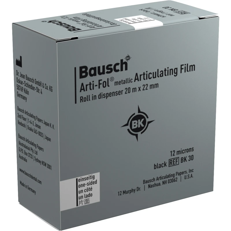 Arti-Fol® metallic 12 µ ist eine High Tech Prüffolie mit deutlich verbesserten Eigenschaften. Diese Prüffolie besteht aus einer metallisierten Polyesterfolie (Shimstock Folie) von nur 12 µ Stärke. Die Kombination aus einer zusammengesetzten Farbbeschichtung und einer metallisierten Folie bringt entscheidende Vorteile bei einigen Anwendungen. Durch die metallisierte Rückseite der Folie kann auch keine Verwechslung zwischen unbeschichteter und beschichteter Farbseite entstehen. Hohe Reißfestigkeit und geringe Materialstärke hervorragend zur Prüfung von approximalen Kontakten beim Einsetzen von Brücken oder Kronen.