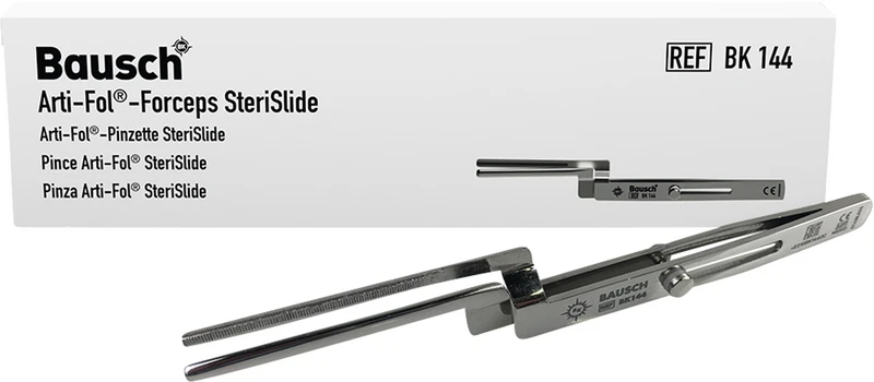Die Bausch Pinzette Arti-Fol® SteriSlide hat eine eingefräster Längsnut zum optimalen Halt von Folien. Darüber hinaus verfügt diese Pinzette über einen Schieber (Sterilisationshilfe), mit dem die Pinzette so geöffnet werden kann, dass durch diese Position eine problemlose, einfache Sterilisation möglich ist.