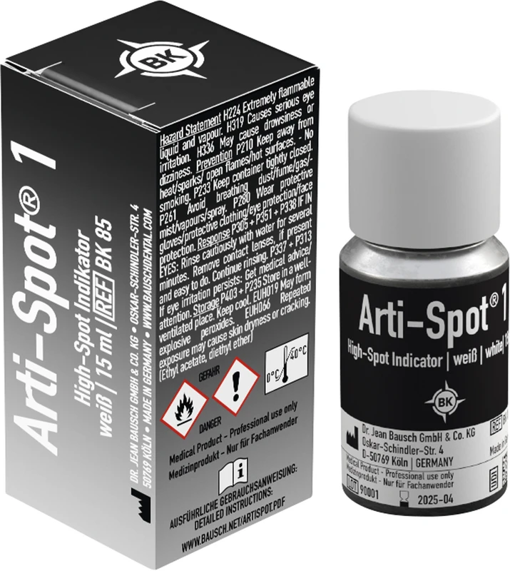 Arti-Spot® ist eine Kontaktfarbe zur Überprüfung der Passgenauigkeit von Kronen, Inlays, Onlays, Teleskopkronen, Klammern sowie Friktionsflächen von Geschieben.