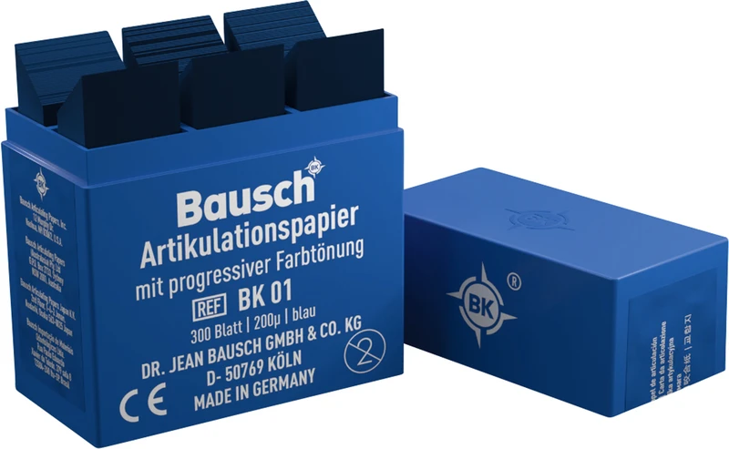 Bausch Artikulationspapier mit progressiver Farbtönung 200 µ zeigt unterschiedliche Aufbisskräfte durch kaudruckabhängig, farbschattierte Anfärbung an: Leichter Aufbissdruck wird hell - Starker Druck dunkel angezeigt. Nur Bausch Artikulationspapier mit progressiver Farbtönung 200 µ kann vorhandene Kaudruckinterferenzen so deutlich aufzeigen. Nach Adjustierung oder Lokalisierung der Fehlkontakte sollte mit dünneren Prüfmitteln, die wir bis zu 8 µ Stärke (Arti-Fol) anbieten, weiter gearbeitet werden.