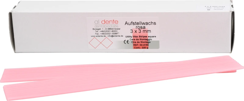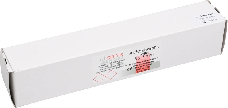 Prothetikwachs. Für das schnelle, sichere Positionieren der Zähne. Einfaches Entfernen durch Ausbrühen. Abmessung: 3 x 3 mm oder 5 x 5 mm.