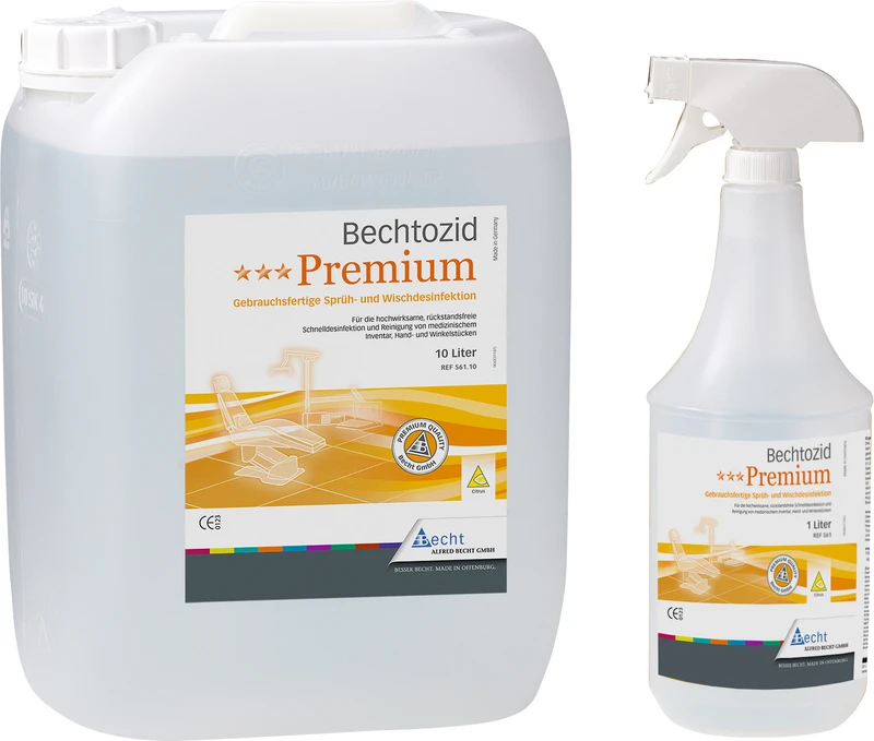 Gebrauchsfertige Sprüh- und Wischdesinfektion für die hochwirksame und rückstandsfreie Desinfektion und Reinigung von med. Inventar, Hand- und Winkelstücken. Bechtozid Premium inaktiviert Adeno-Viren in 1 Minute und Polio-Viren in 2 Minuten und erfüllt die Anforderungen an die vollständige Viruzidie. Gelistet bei der DGHM/VAH. Das Produkt wirkt bakterizid einschl. M.terrae, fungizid und inaktiviert HBV/HIV/HCV/Vaccinia-Viren sowie H1N1-Viren in 30 Sekunden. Duftvarianten Citrus und Parfümfrei.