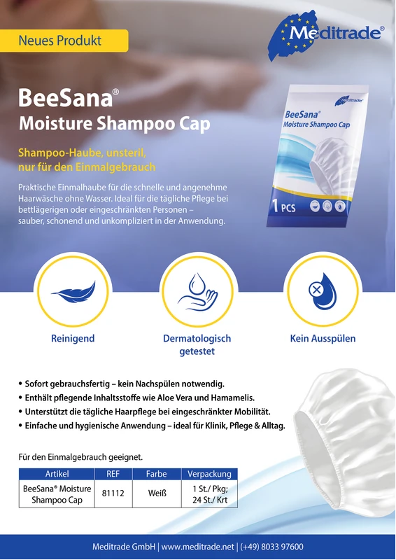 Shampoo-Haube, unsteril, nur für den Einmalgebrauch. Die Waschkappe ermöglicht eine effektive Reinigung und Pflege von Haar und Kopfbereich bei pflegebedürftigen Patienten. Das Produkt eignet sich besonders für Patienten, die aufgrund von Krankheit oder körperlicher Einschränkung Unterstützung bei der Körperpflege benötigen. Die innovative Formel der Barriere-Creme sorgt dafür, dass Hautreizungen minimiert und die tägliche Reinigung komfortabel und schonend durchgeführt werden kann.