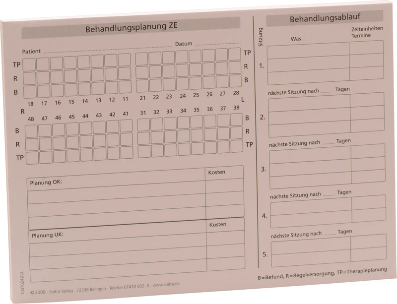 ZE Behandlungsplanung - Es stehen Ihnen 5 Sitzungen getrennt für Ober- und Unterkiefer zur Verfügung. In den rechten Spalten finden Sie ausreichend Platz für Termine oder individuelle Notizen.