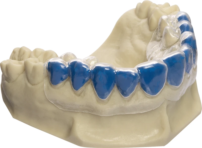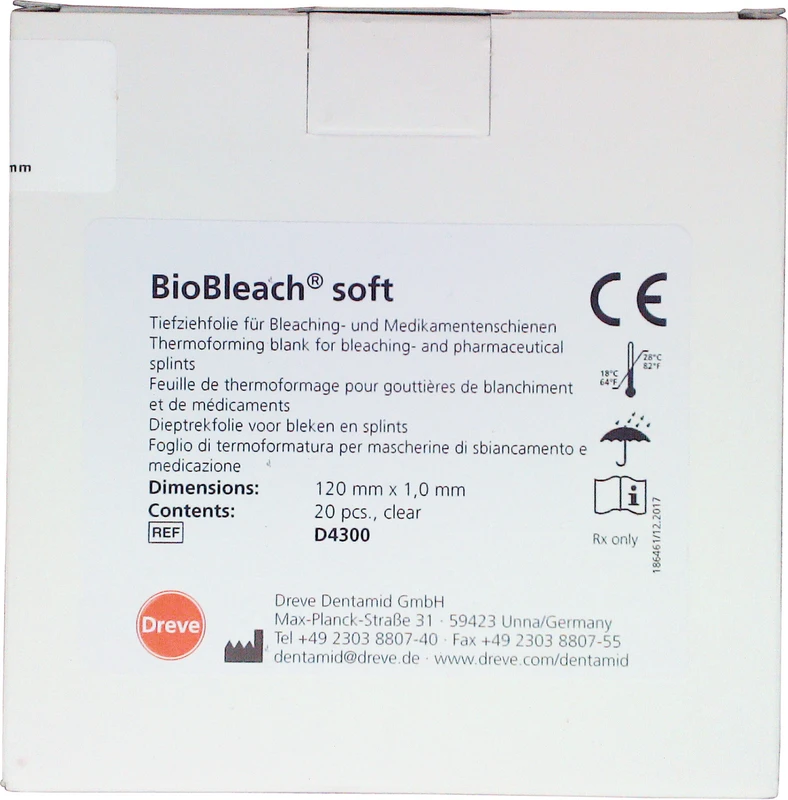BioBleach® soft Tiefziehfolie aus Ethyl-Vinylacetat Copolymerisat zur Anfertigung von weichen, über den Gingivalsaum hinausreichenden Bleaching-/Medikamentenschienen.