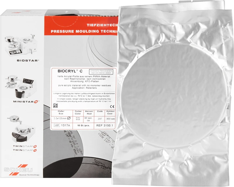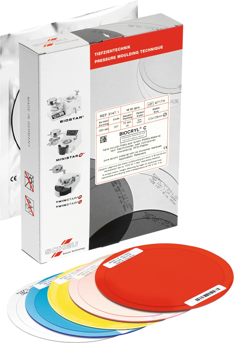Schlagzähe Acrylplatten aus reinem PMMA, monomerfrei, ohne allergene Reizstoffe, verbinden sich mit Autopolymerisat. Anwendungen: Prothesenbasen, Immediatprothesen, Retainer, KFO-Dehnplatten und Schienen.