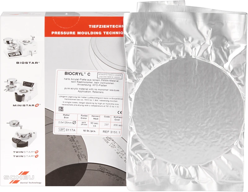 Schlagzähe Acrylplatten aus reinem PMMA, monomerfrei, ohne allergene Reizstoffe, verbinden sich mit Autopolymerisat. Anwendungen: Prothesenbasen, Immediatprothesen, Retainer, KFO-Dehnplatten und Schienen.