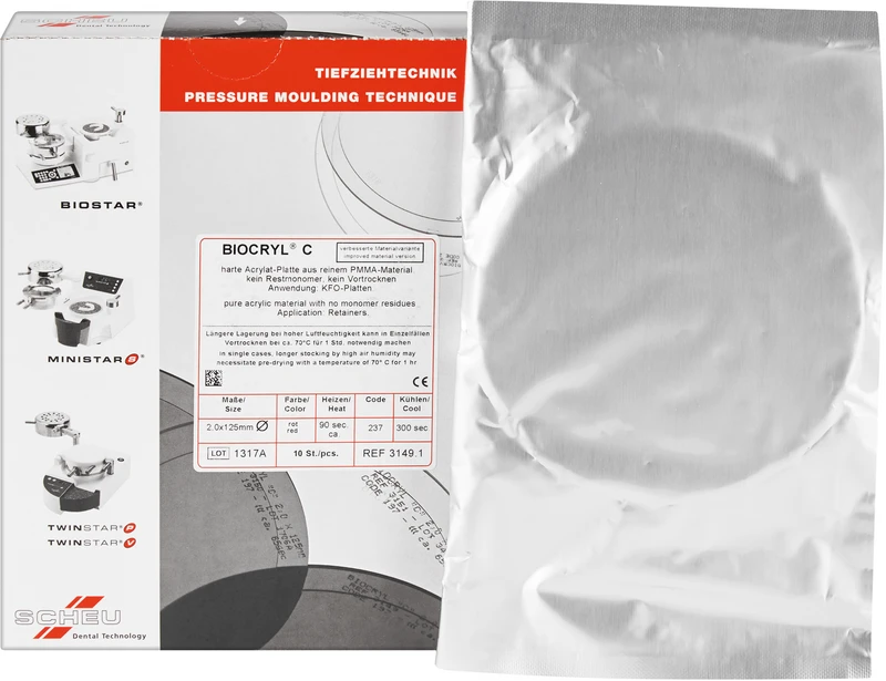 Schlagzähe Acrylplatten aus reinem PMMA, monomerfrei, ohne allergene Reizstoffe, verbinden sich mit Autopolymerisat. Anwendungen: Prothesenbasen, Immediatprothesen, Retainer, KFO-Dehnplatten und Schienen.