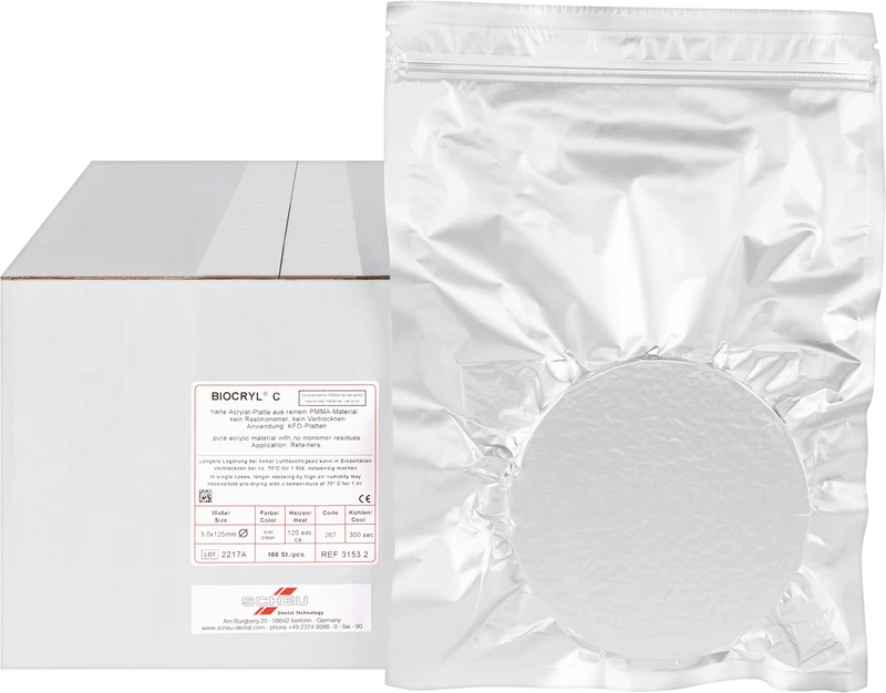 Schlagzähe Acrylplatten aus reinem PMMA, monomerfrei, ohne allergene Reizstoffe, verbinden sich mit Autopolymerisat. Anwendungen: Prothesenbasen, Immediatprothesen, Retainer, KFO-Dehnplatten und Schienen.
