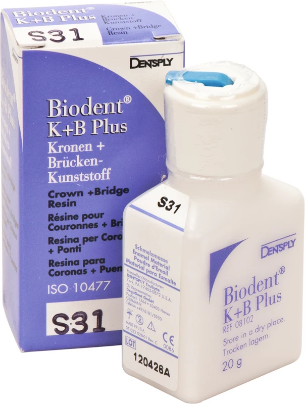 Biodent® K+B Plus ist ein Kunststoff für Kronen- und Brückenverblendungen, Mantelkronen, Vorwall-und Küvettentechnik, provisorische Kronen und Brücken, Korrekturen und Reparaturen. Biodent® K+B Plus besteht aus dem Dentalwerkstoff IPN, einem Gemisch aus ausgewählten Polymeren ohne Füllstoff mit hohem Anteil vernetzter Moleküle (Perlen).