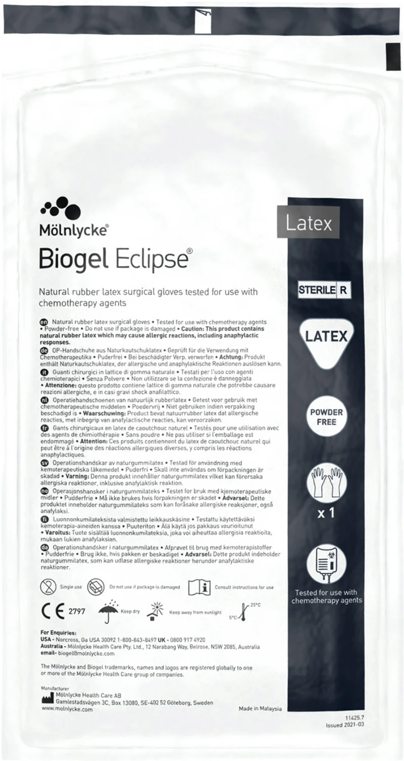 Der Biogel® Eclipse® OP-Außenhandschuh ist weicher als unser Standard-OP-Handschuh. Das Design sorgt für ein angenehm weiches Tragegefühl mit der Naturkautschuklatex eigenen Festigkeit und Elastizität für das extra Fingerspitzengefühl und die Geschicklichkeit, die Sie bei chirurgischen Eingriffen brauchen.Sie können ihn als Einzelhandschuh oder in Kombination mit einem Biogel Indicator Underglove tragen. Dadurch wird ein Perforationsindikationssystem mit deutlicher, schneller und großflächiger Perforationsindikation gebildet für einen Schutz, den man sehen kann.Dieser Handschuh wurde auch für die Verwendung mit Chemotherapeutika gemäß ASTM D6978 getestet.