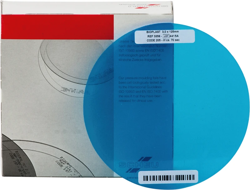 Weichelastische, gummiähnliche Folien, verbinden sich nicht mit Autopolymerisat. Anwendung: Einfarbiger Mundschutz, Positioner.