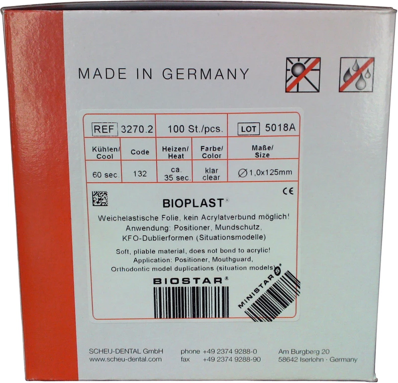 Weichelastische gummiähnliche Folien, verbinden sich nicht mit Autopolymerisat. Für Dublierformen, Sportmundschutz, Knirschschutz, Positioner, OSAMU-Retainer® und Bleichschienen.