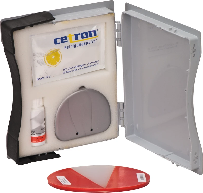 Kit 5 mm BIOPLAST XTREME-Folie rot, 1 Beutel CETRON-Reinigungspulver, 1 Retainerdose, 1 BIOPLAST-Isoliermittel