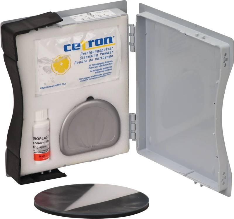 Kit 5 mm BIOPLAST XTREME-Folie schwarz, 1 Beutel CETRON-Reinigungspulver, 1 Retainerdose, 1 BIOPLAST-Isoliermittel