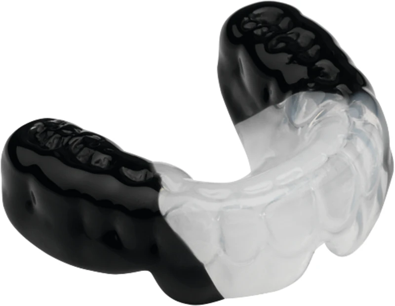 Zwei unterschiedliche Härtegrade in einer Tiefziehfolie durch die integrierte Verstärkung im sensiblen Frontzahnbereich. Harte und kleinflächige Schläge bei Kontaktsportarten werden absorbiert. Die V-Form des härteren Inserts (Shore A: 92) ermöglicht eine variable Breite des Frontzahnschutzes.