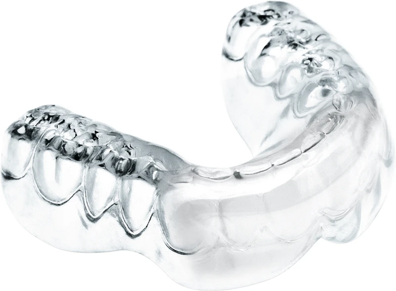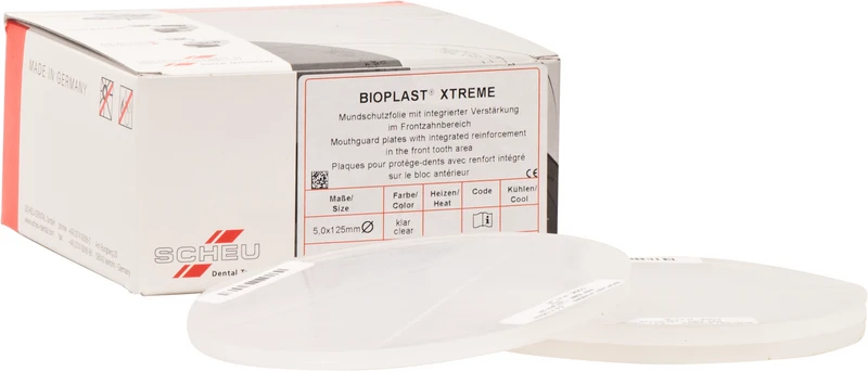 Zwei unterschiedliche Härtegrade in einer Tiefziehfolie durch die integrierte Verstärkung im sensiblen Frontzahnbereich. Harte und kleinflächige Schläge bei Kontaktsportarten werden absorbiert. Die V-Form des härteren Inserts (Shore A: 92) ermöglicht eine variable Breite des Frontzahnschutzes.