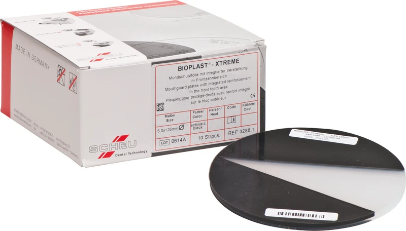 Zwei unterschiedliche Härtegrade in einer Tiefziehfolie durch die integrierte Verstärkung im sensiblen Frontzahnbereich. Harte und kleinflächige Schläge bei Kontaktsportarten werden absorbiert. Die V-Form des härteren Inserts (Shore A: 92) ermöglicht eine variable Breite des Frontzahnschutzes.