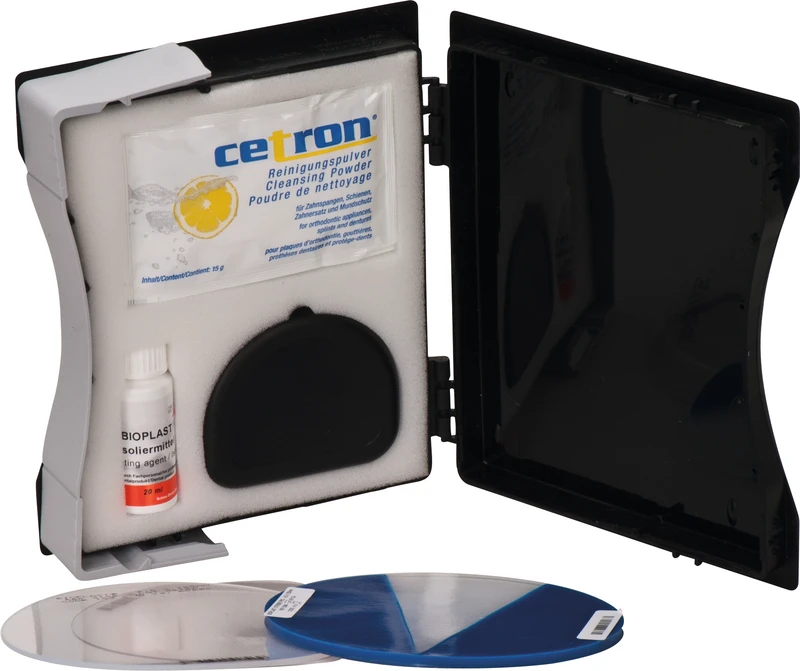 Kit 4 mm BIOPLAST XTREME-Folie blau, 2 mm BIOPLAST-Folie klar, 0,75 mm DURAN-Folie, 1 Beutel CETRON-Reinigungspulver, 1 Retainerdose, 1 BIOPLAST-Isoliermittel
