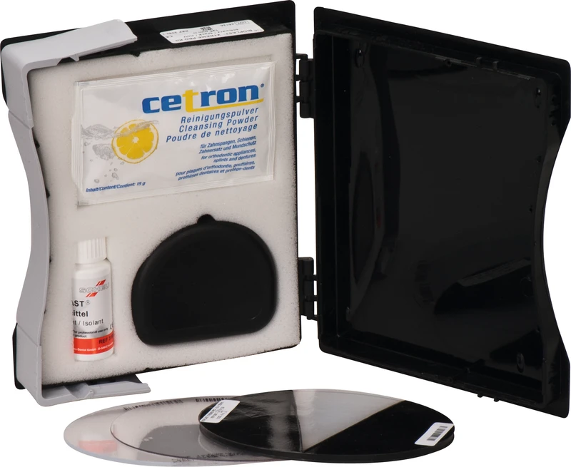 Kit 4 mm BIOPLAST XTREME-Folie schwarz, 2 mm BIOPLAST-Folie klar, 0,75 mm DURAN-Folie, 1 Beutel CETRON-Reinigungspulver, 1 Retainerdose, 1 BIOPLAST-Isoliermittel