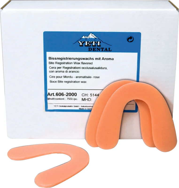 Der Bissregistrierungswachs ist sehr hart. Es ist selbst bei erhöhten Außentemperaturen durch seinen hohen Schmelzpunkt dimensionsstabil. Das zugesetzte Orangenaroma erleichtert dem Patienten die Bissregistrierung.