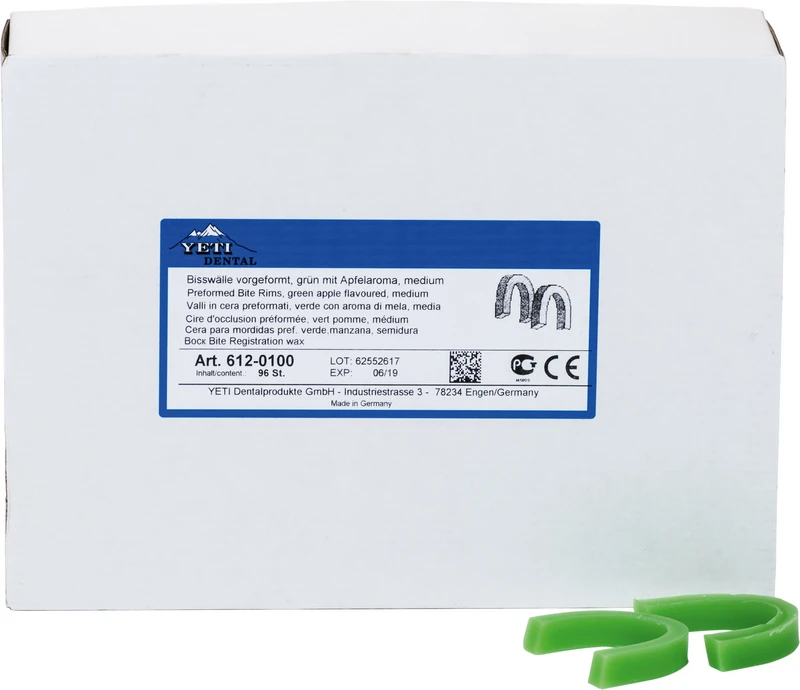 Erleichtern Sie sich Ihre Arbeit und verwenden Sie Bisswälle. Sie sind fertig vorgeformt und entsprechen den Kieferverhältnissen. Es gibt sie ebenfalls, wie die Bissnehmewachse in 3 verschiedenen Härtegraden, aber in 4 verschiedenen Farben. Die hinzugekommene Farbe orange ist mit Orangenaroma versetzt und entspricht dem Härtegrad mittel.