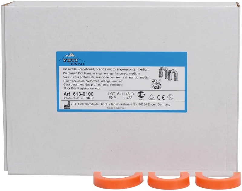 Erleichtern Sie sich Ihre Arbeit und verwenden Sie Bisswälle. Sie sind fertig vorgeformt und entsprechen den Kieferverhältnissen. Es gibt sie ebenfalls, wie die Bissnehmewachse in 3 verschiedenen Härtegraden, aber in 4 verschiedenen Farben. Die hinzugekommene Farbe orange ist mit Orangenaroma versetzt und entspricht dem Härtegrad mittel.