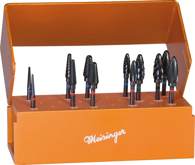 Sortiment mit ausgewählten Hartmetallfräsern der MEISINGER Black Cobra Line für die Nutzung im Dentallabor. Die besondere CABOCER® Beschichtung optimiert die Leistung der Instrumente und besticht durch extreme Härte, geringen Verschleiß und niedrigste Reibwerte. Die charakteristische schwarze Farbe der Instrumente ermöglicht Ihnen zusätzlich blendfreies Arbeiten.Drehzahlen