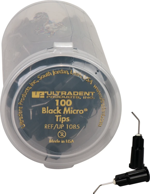 Schwarzer Kunststoff mit Metallkanüle (22 ga, Ø 0,7 mm), gebogen zur Feinapplikation von lichthärtenden und nicht-lichthärtenden Materialien.