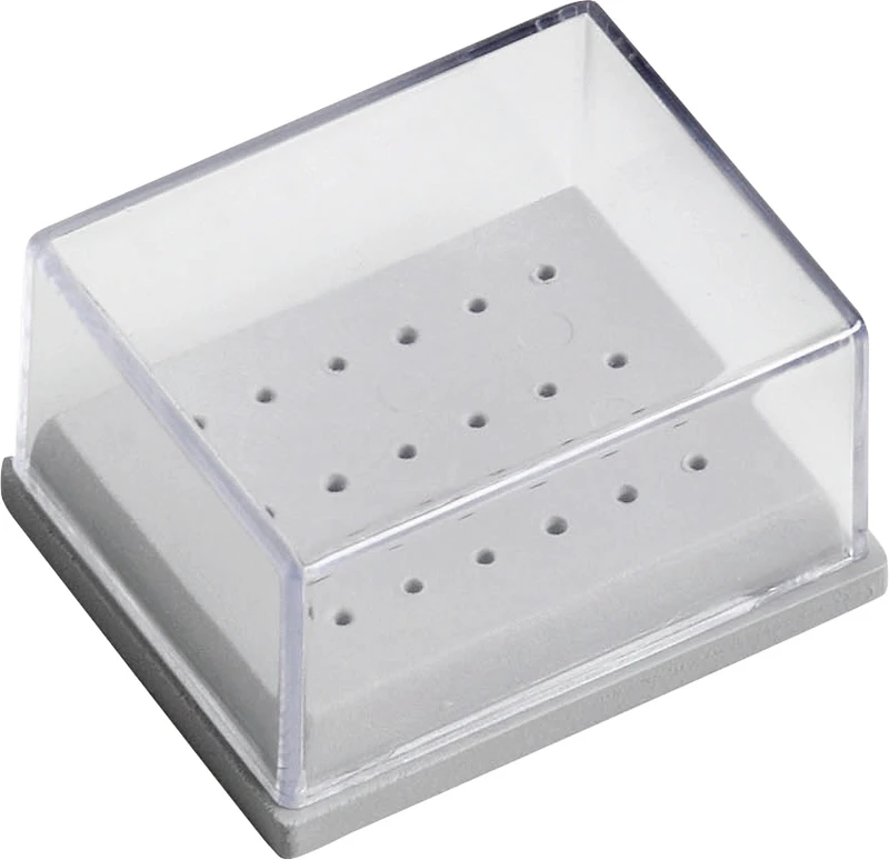 Ständer für dentale Bohraufsätze mit einem Deckel aus transparentem Kunststoff. Das FG-Modell ist geeignet für Instrumente mit einem Schaftdurchmesser von ca. 1.6 mm. Das RA-Modell hält Aufsätze mit einem Durchmesser von 2.35 mm. Monoart Bohrerständer sind in drei Größen, für 18, 36 oder 72 Bohrer, erhältlich. Aufsätze für Hand- und Winkelstücke und Turbinen sind das wichtigste Handwerkszeug zur Reparatur und Pflege von Patientengebissen. Sie gehören zu den wertvollsten Instrumenten in der Zahnarztpraxis. Ein sterilisierbarer Bohrerständer hilft beim sorgsamen und strukturierten Umgang mit diesen Feinwerkzeugen. Euronda Monoart Bohrerständer werden zur Aufbewahrung und Bereitstellung von Dentalbohrern eingesetzt. Sie bestehen aus einer gelochten Basis und einem tranparenten Deckel aus Klarsichtkunststoff.