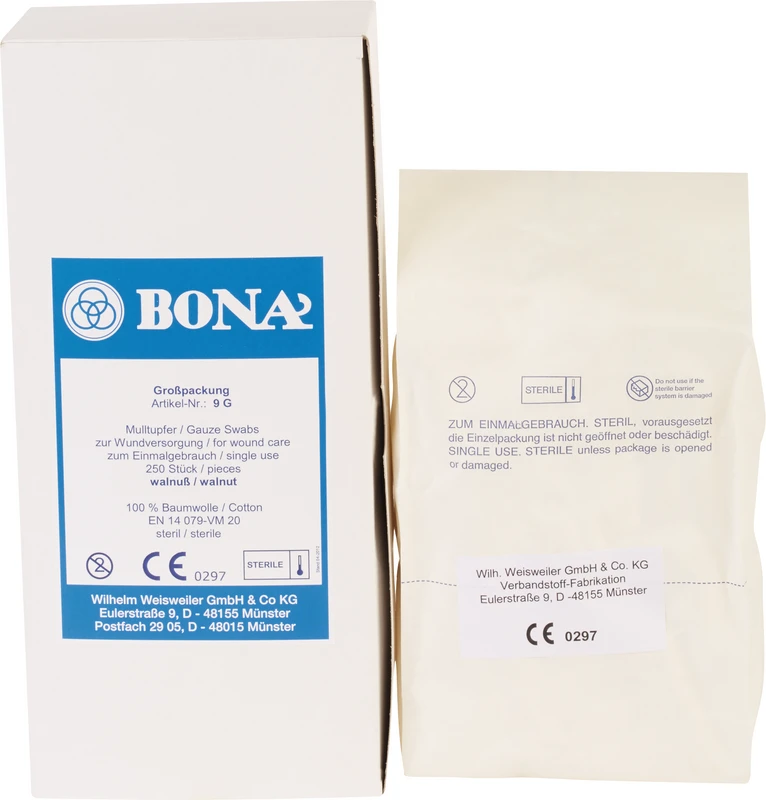 BONA Mulltupfer.Aus Verbandmull EN 14079-VM 20, 20-fädig, 100 % Baumwolle, gleichmäßiges Format, schnell saugend, fädchenfrei.