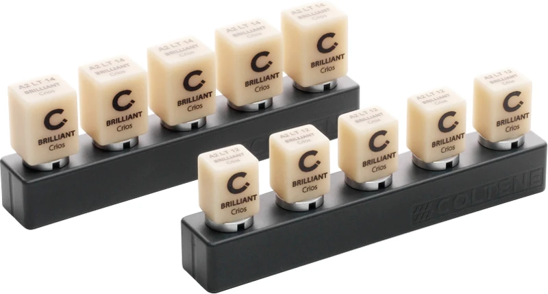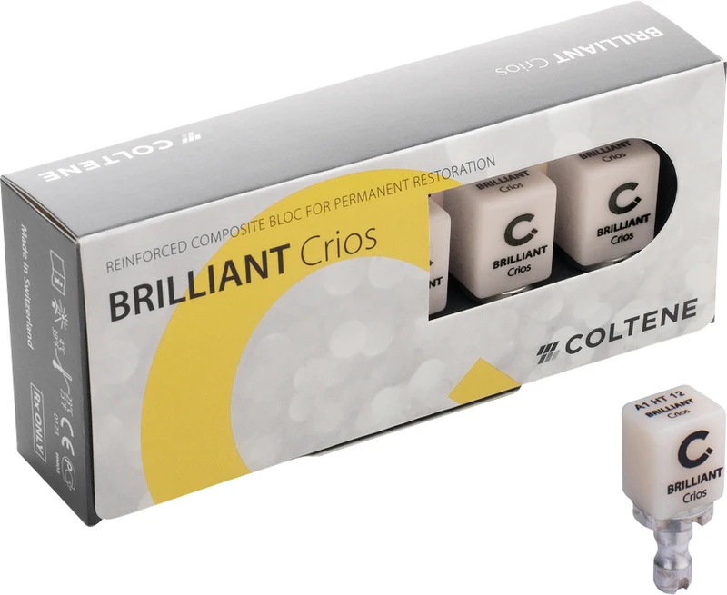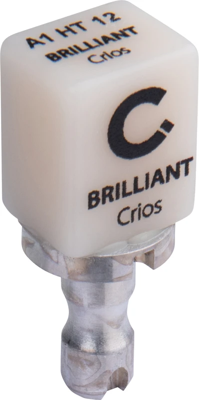 BRILLIANT Crios ist ein Reinforced Composite Block für permanente Restaurationen. Er wird mit CAD/CAM Geräten für die Chairside-Herstellung indirekter Restaurationen verwendet. BRILLIANT Crios wird in 9 Low- und 4 High-Transluzenzstufen in den Größen 14 und 12 angeboten und ist kompatibel mit Sirona Geräten (CEREC und inLab). Es ist geplant, mit weiteren Systemanbietern zusammen zu arbeiten.