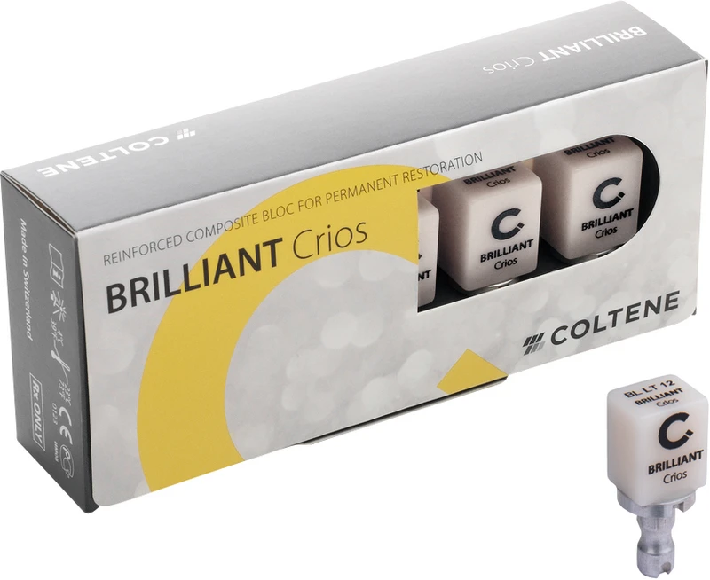 BRILLIANT Crios ist ein Reinforced Composite Block für permanente Restaurationen. Er wird mit CAD/CAM Geräten für die Chairside-Herstellung indirekter Restaurationen verwendet. BRILLIANT Crios wird in 9 Low- und 4 High-Transluzenzstufen in den Größen 14 und 12 angeboten und ist kompatibel mit Sirona Geräten (CEREC und inLab). Es ist geplant, mit weiteren Systemanbietern zusammen zu arbeiten.