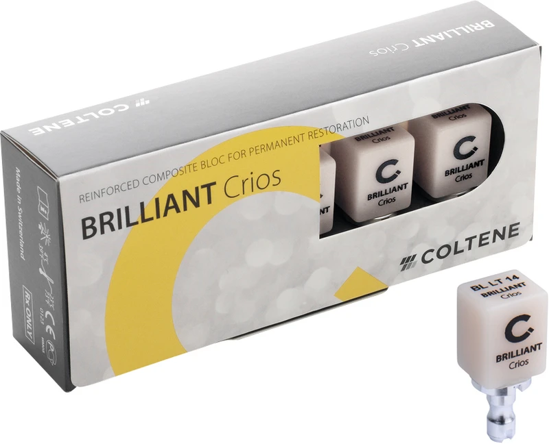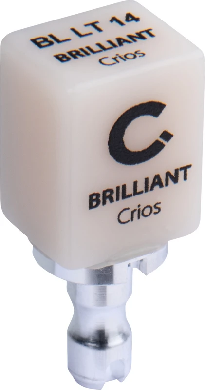 BRILLIANT Crios ist ein Reinforced Composite Block für permanente Restaurationen. Er wird mit CAD/CAM Geräten für die Chairside-Herstellung indirekter Restaurationen verwendet. BRILLIANT Crios wird in 9 Low- und 4 High-Transluzenzstufen in den Größen 14 und 12 angeboten und ist kompatibel mit Sirona Geräten (CEREC und inLab). Es ist geplant, mit weiteren Systemanbietern zusammen zu arbeiten.