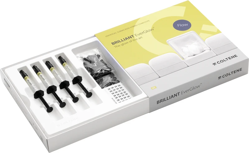 BRILLIANT EverGlow ist nun zusätzlich in einer fließfähigen Variante erhältlich. Das niederviskose Füllungsmaterial verbindet komfortables Applizieren mit gleichzeitig hoher Standfestigkeit. Ideal zum Auffüllen schwer erreichbarer Bereiche sowie zur Fissurenversiegelung. Die Flow-Variante kann material- und zeitsparend direkt aus der Spritze auf die gebondete Oberfläche aufgetragen werden. Bis zur Polymerisation lässt sich das unter Druck fließfähige Komposit in aller Ruhe an die gewünschte Position bringen.