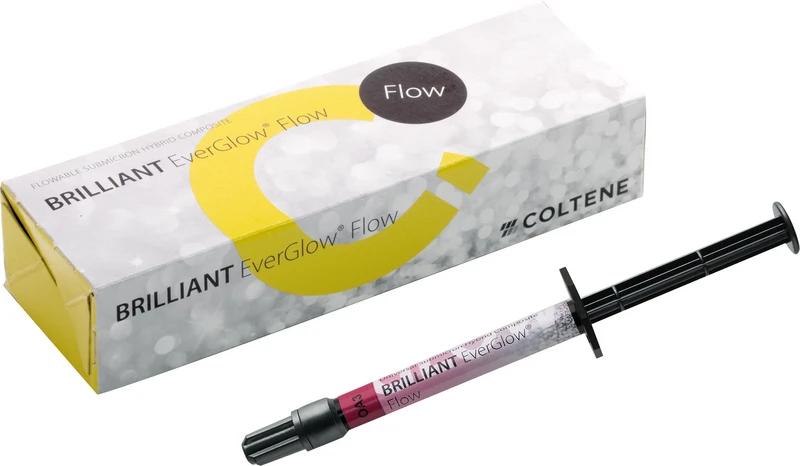 BRILLIANT EverGlow ist nun zusätzlich in einer fließfähigen Variante erhältlich. Das niederviskose Füllungsmaterial verbindet komfortables Applizieren mit gleichzeitig hoher Standfestigkeit. Ideal zum Auffüllen schwer erreichbarer Bereiche sowie zur Fissurenversiegelung. Die Flow-Variante kann material- und zeitsparend direkt aus der Spritze auf die gebondete Oberfläche aufgetragen werden. Bis zur Polymerisation lässt sich das unter Druck fließfähige Komposit in aller Ruhe an die gewünschte Position bringen.
