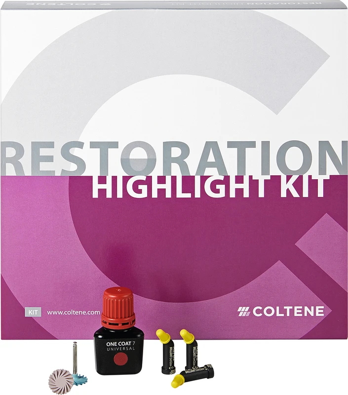 Kit Restoration Highlight 30 x 0,2 g Cap (A1/B1, A2/B2, A3/D3), 5 ml One Coat 7 Universal, 50 Bürstchen schwarz, 2 DIATECH ShapeGuard für Komposit (1 Vorpolierer, 1 Hochglanzpolierer)