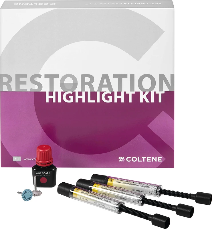 Kit Restoration Highlight 3 x 3 g Spritze (A1/B1, A2/B2, A3/D3), 5 ml One Coat 7 Universal, 50 Bürstchen schwarz, 2 DIATECH ShapeGuard für Komposit (1 Vorpolierer, 1 Hochglanzpolierer)