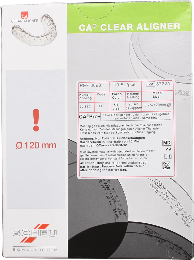 Dreischichtige Alignerfolie mit flexiblem Elastomerkern in einer hartelastischen Doppelschale für eine kontinuierliche Kraftübertragung mit minimalem Kraftverlust. Die flexible Elastomerschicht sorgt für eine hohe Elastizität und Bruchsicherheit bei reduzierter Initialkraft und entsprechend angenehmem Tragekomfort. Mit aufgebrachter Isolierfolie.
