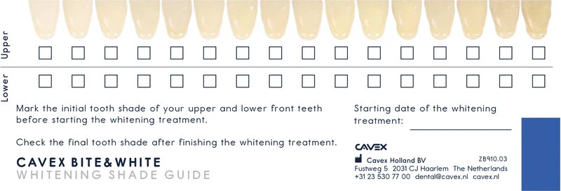 Das professionelle Bleichsystem für zu Hause Cavex Bite&White Ready 2 Use ist ein schnelles, sicheres und vor allem sehr einfaches Bleichsystem, das ausschließlich über den Zahnarzt erhältlich ist. Öffnen Sie die Verpackung, nehmen Sie die vorgefüllte Bleichschiene eine Stunde in den Mund und genießen Sie das Ergebnis. Einfacher geht es nicht!