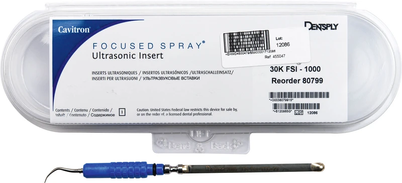 FSI Einsatz zur supragingivalen Behandlung mit klassischem Griffdesign. Focus Spray Inserts bieten durch das patentierte Sprühsystem größere Leistungsfähigkeit bei gleichzeitig reduzierter Wassermenge. Der fokussierte und temperierte Spraystrahl bietet verbesserte Sicht im Arbeitsfeld.