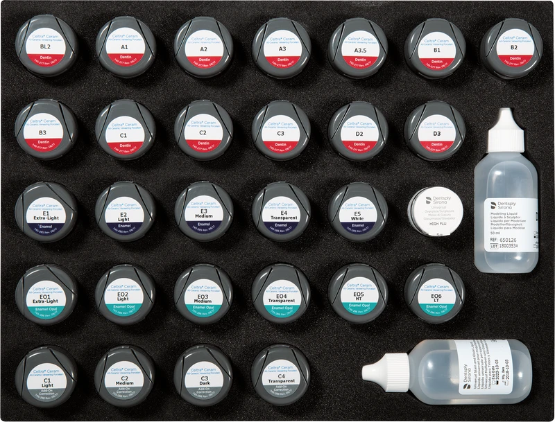Basic Kit 7 x 15 g dentin (BL2, A1, A2, A3, B1, C1, C2, D2), 6 x 15 g Power dentin (PD1, PD2, PD4, PD5, PD6), 5 x 15 g enamel (extra-light, light, medium, transparent, white), 6 x 15 g enamel opal (extra-light, light, medium, transparent, HT, LT), 4 x 15 g add-on correction (C1, C2, C3, C4), 5 g DS Universal Overglaze High Flu, 50 ml DS Modeling Liquid, 50 ml Universal Stain & Glaze Liquid, 1 DS Portionierer, 1 Magic Wizard Brush, 1 Magic Stain Brush, 1 Occlu Speed Brush, 2 Shade Guide (Basic Indicator 1, Basic Indicator 2)
