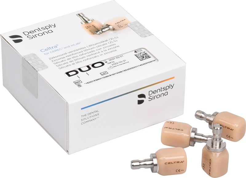 Celtra® Duo ist ein CAD/CAM-Block für die Chairside-Anwendung in CEREC-Geräten von Dentsply Sirona. Er enthält eine hochfeste Glaskeramik aus zirkonverstärktem Lithiumsilikat (ZLS), das sich durch hohe Biegefestigkeit, eine schöne Ästhetik, aufgrund seiner Opaleszenz und Transluzenz, sowie durch leichte Bearbeitbarkeit auszeichnet. Dank dieses neuen Werkstoff es lässt sich Celtra® Duo je nach klinischer Anforderung verarbeiten: Entweder ohne Brennen mit der nahezu doppelten Festigkeit konventioneller Glaskeramik oder mit einem kurzen Glasurbrand, der die Festigkeit auf das Niveau von Lithium Disilikat erhöht. Ein Block, zwei Möglichkeiten - Celtra® Duo vereint die Vorteile bisheriger CEREC-Blöcke in nur einem Produkt.